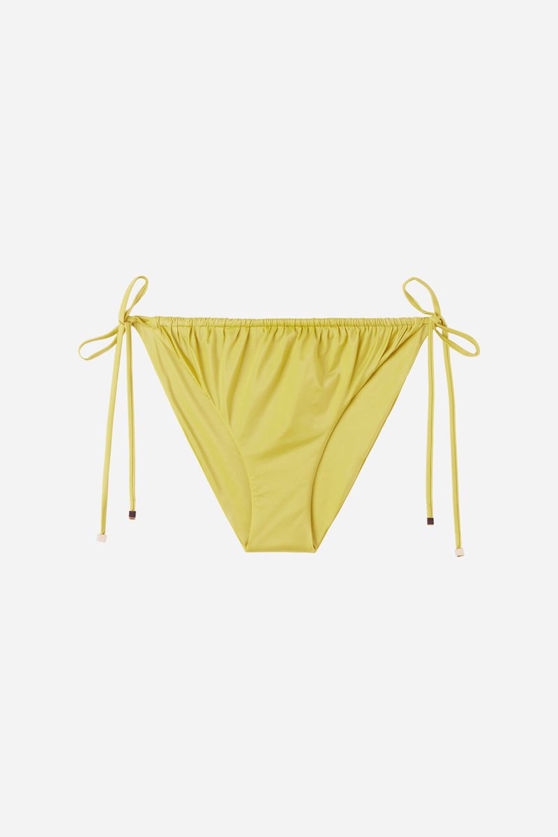 Calcinha de biquíni com amarrações laterais para ajustar o tamanho. O estilo apresenta um tecido brilhante com efeito seda, adornado por babados e ponteiras douradas. Totalmente forrada com costuras invisíveis.