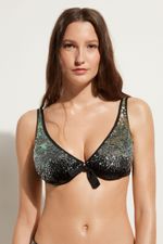 Parte de cima de biquíni estilo balconette com alças largas, sem bojo e com aro. Destaca-se pela aplicação de elegantes paêtes em tons degradê. Alças ajustáveis e removíveis na parte de trás, podendo ser cruzadas ou amarradas na nuca. Fechamento posterior com gancho e duplo ajuste.